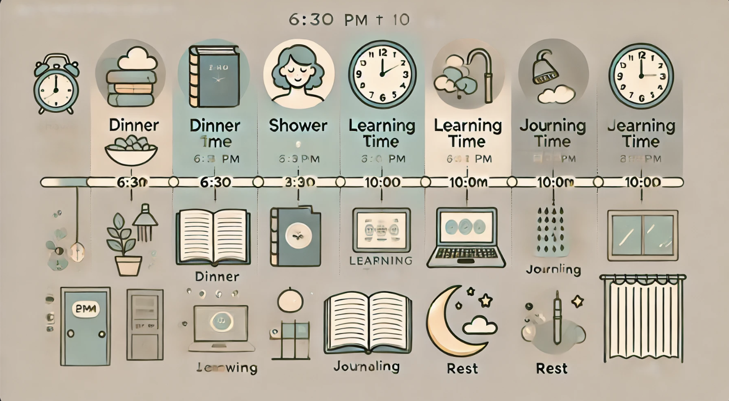 - 저녁 식사 후 30분 휴식 → 자기계발 1시간 → 가벼운 마무리 루틴
