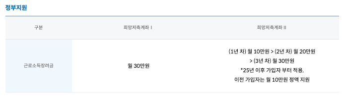 - 2025년 이후 가입자: 1년 차 10만원, 2년 차 20만원, 3년 차 30만원 근로소득장려금