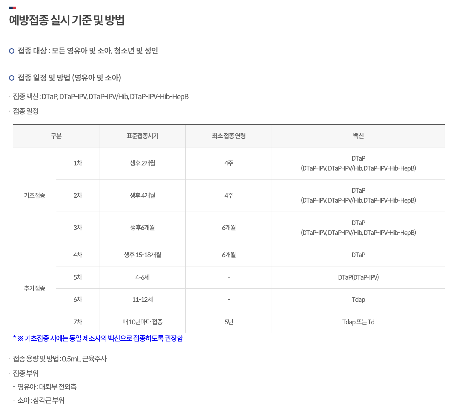 - 영유아는 DTaP 일정에 따라 기초접종을 진행합니다.
