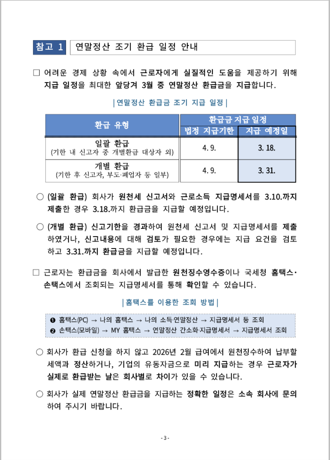 - 2026년 3월 18일: 국세청의 회사 조기 지급 예정일