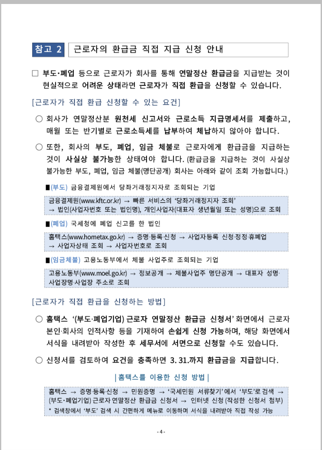 - 미수령 환급금: 홈택스 국세환급금찾기 메뉴 활용