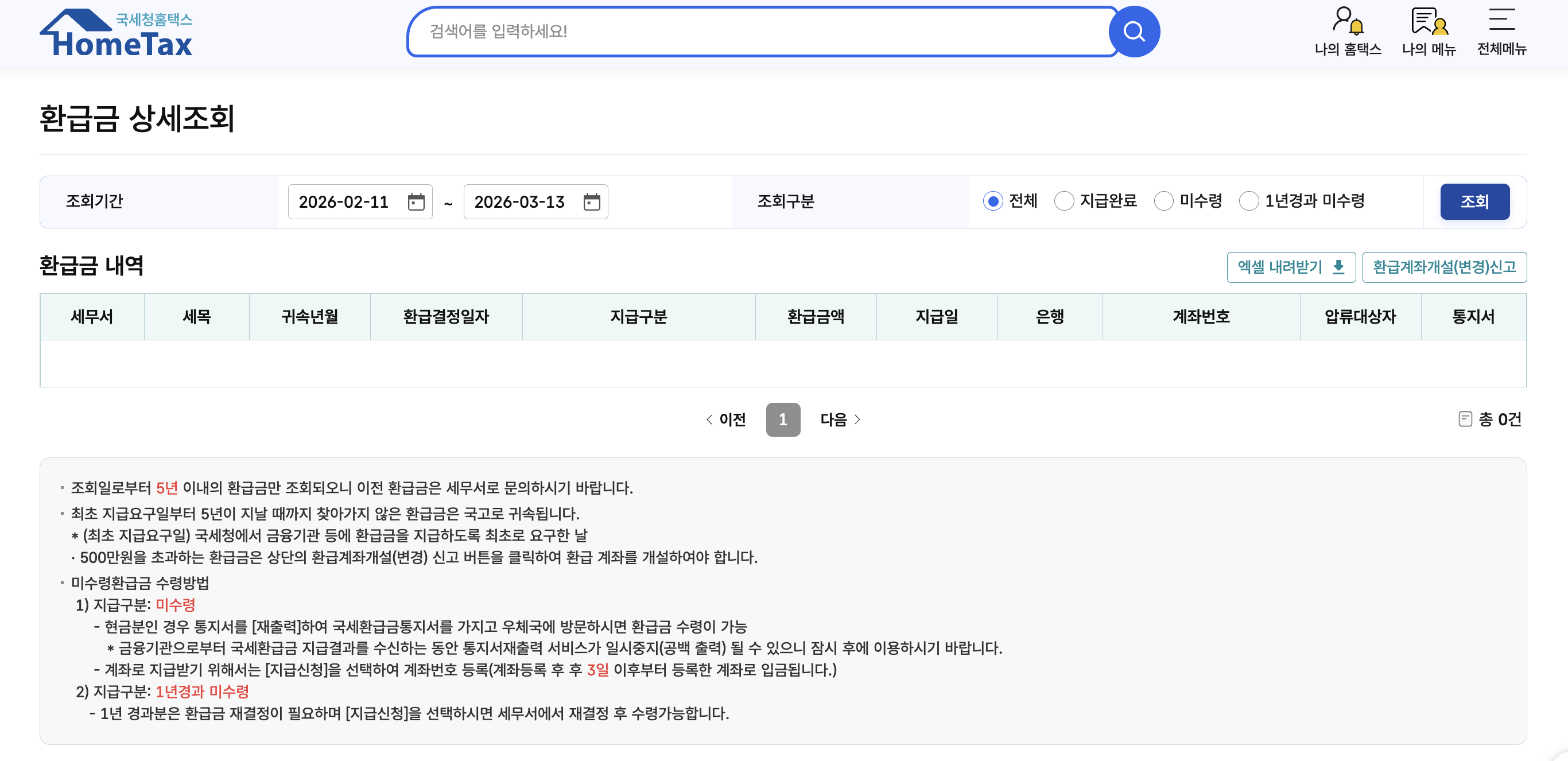- 미수령 환급금: 홈택스 국세환급금찾기 메뉴 활용