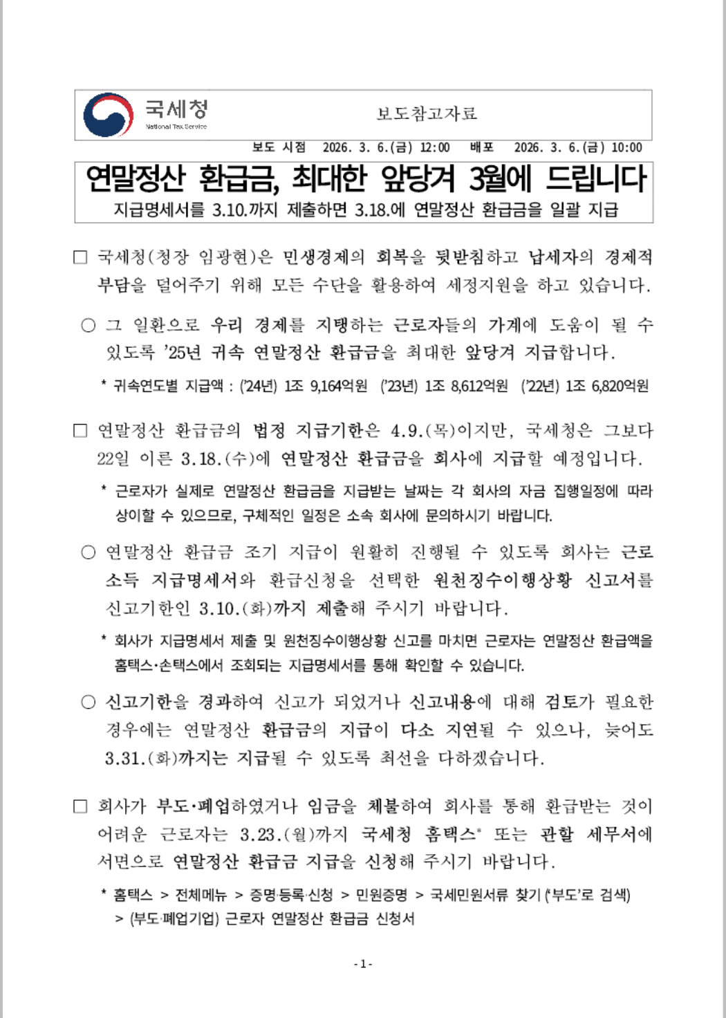- 2026년 3월 18일: 국세청의 회사 조기 지급 예정일