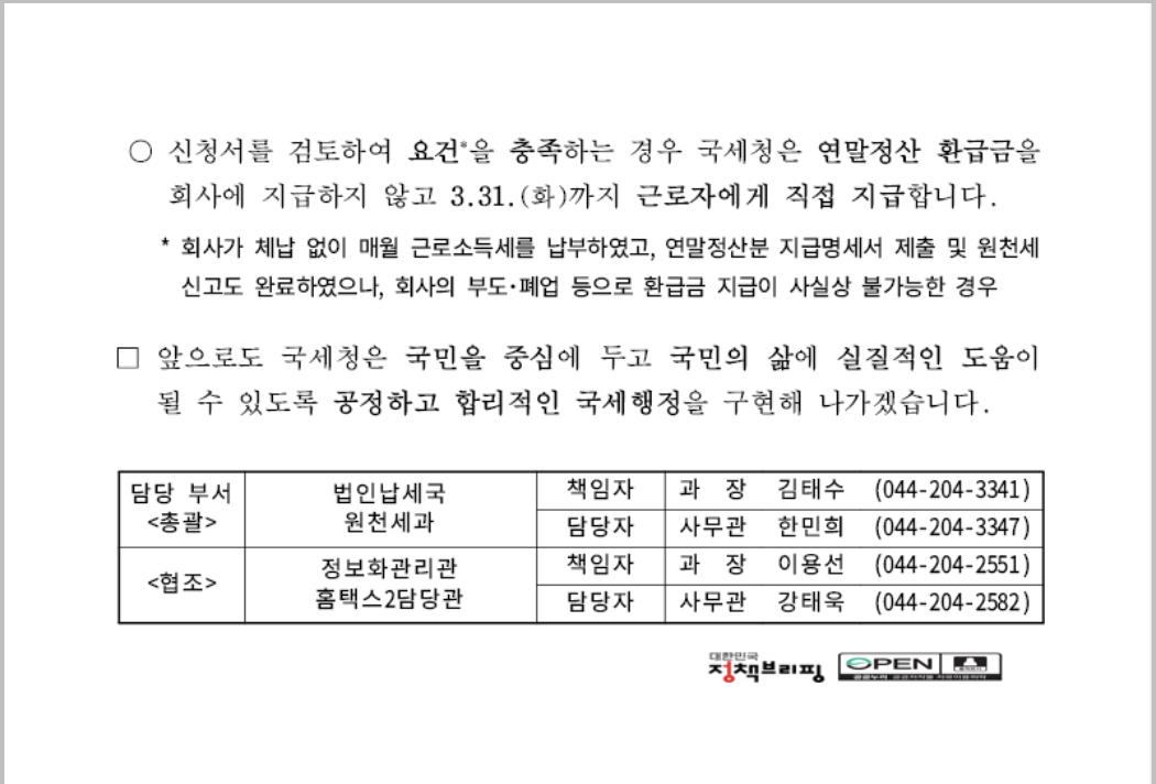 즉 대부분의 직장인은 별도로 환급신청 버튼을 누르는 것이 아니라, 연말정산 자료를 회사에 제출하는 방식으로 환급 절차가 진행됩니다. 예외적으로 회사를 통해 받기 어려운 상황에서는 직접 신청 가능 여부를 확인해야 합니다.
